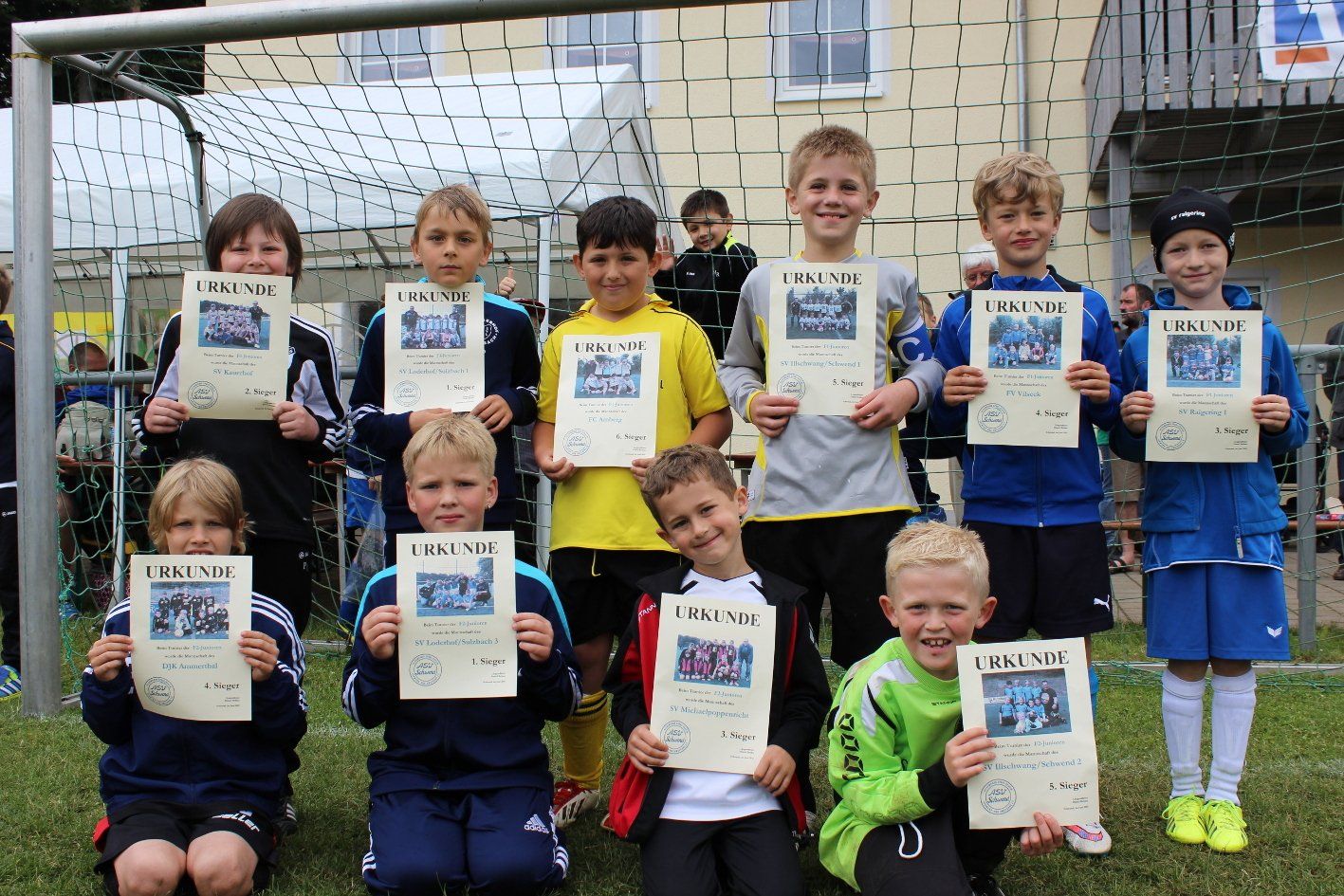 In hoch spannenden Spielen errangen die „Kicker“ der SpVgg Weigendorf den Turniersieg mit einem knappen 1 : 0 Sieg im Endspiel gegen den SV Loderhof/Sulzbach. Auf die weiteren Plätze folgten der SV Kauerhof, der FC Edelsfeld, der SV Raigering, der FC Neukirchen und der FSV Gärbershof. Bedingt durch eine Schulveranstaltung trat von der Heimmannschaft des SV Illschwang/Schwend ausschließlich der jüngste Jahrgang an und beendete das Turnier leider mit dem letzten Platz.